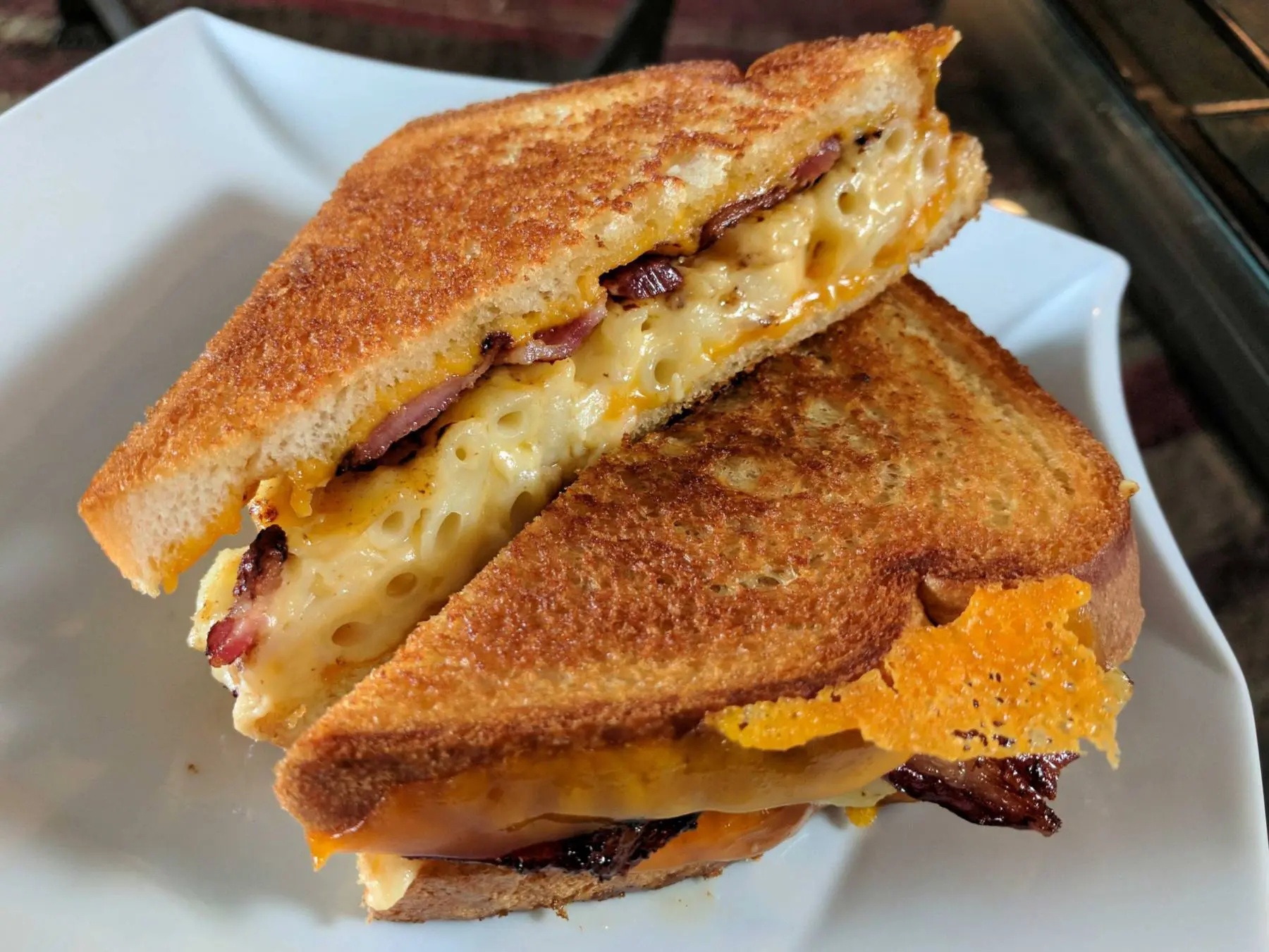 - 4. Top one of the bread slices with cheese slice. Place two slices of bacon on top of the cheese. Use spatula to transfer one mac & cheese square onto cheese and bacon-covered bread in the skillet.